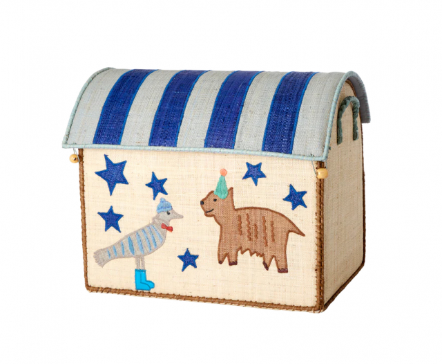 Mellemstor opbevaringskurv i naturlig raffia med det sødeste festlige dyreprint og blå detaljer. Denne kurv er med en skøjteløbende fugl og dyr i festhatte omgivet af stjerner - klar til at fejre! Lavet i et naturligt og bæredygtigt materiale og perfekt til opbevaring på børneværelset, til sko i gangen eller stuen, hvor du ikke vil have for meget frem. Varenr: BSHOU-MPABEAN kode for produktet: - Kontakt os